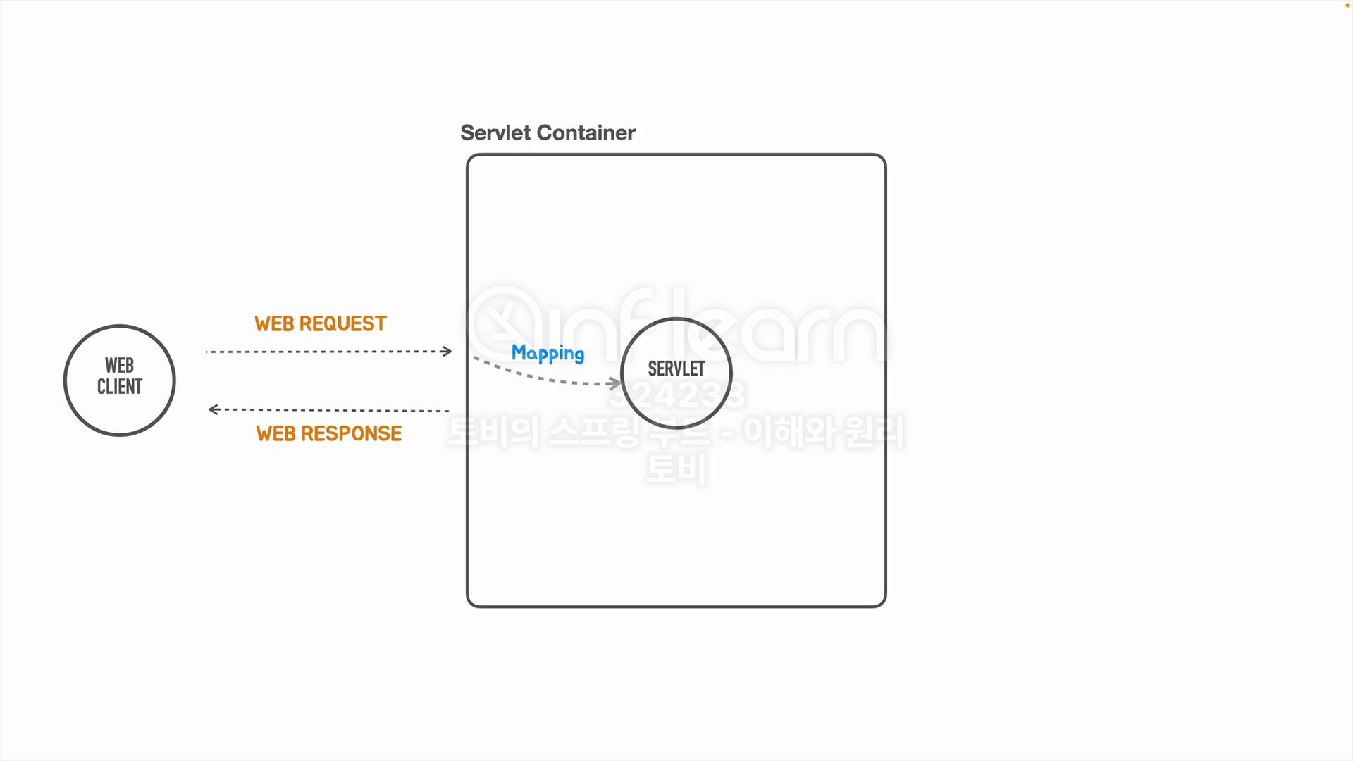 서블릿 컨테이너에서 관리되는 웹 컴포넌트를 서블릿이라고 한다. 서블릿 컨테이너는 1개 이상의 서블릿을 관리할 수 서블릿 컨테이너는 웹 클라이언트로 요청을 받으면 여러개의 서블릿 중에서 어떤 서블릿에게 요청을 처리하면 될지를 결정하는데 그 과정을 매핑이라고 합니다. 매칭된 서블릿은 웹 응답을 만들기 위해 필요로하는 작업을 수행하고 작업을 종료하면 컨테이너가 다시 웹 클라이언트에게 웹 응답형태로 돌려줍니다.