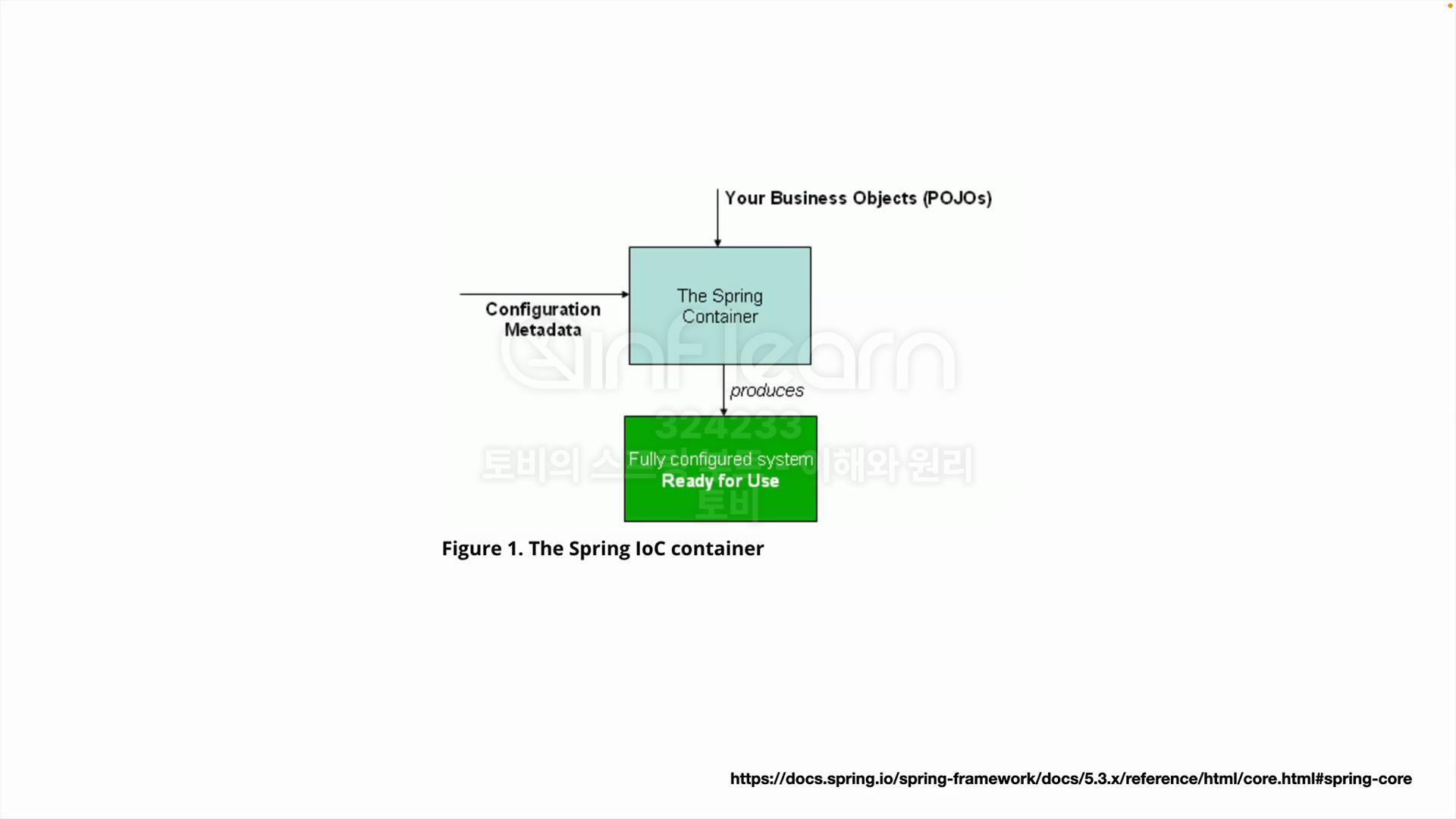 스프링 컨테이너는 크게 두가지를 필요로 하는데 비즈니스 오브젝트 포조 라고 하는 자바 오브젝트를 가 필요합니다. 또한 포조 자바 객체를 만든 코드를 어떤식으로 구성할지에 대한 정보를 담고있는 Configuration Metadata를 필요로 합니다.