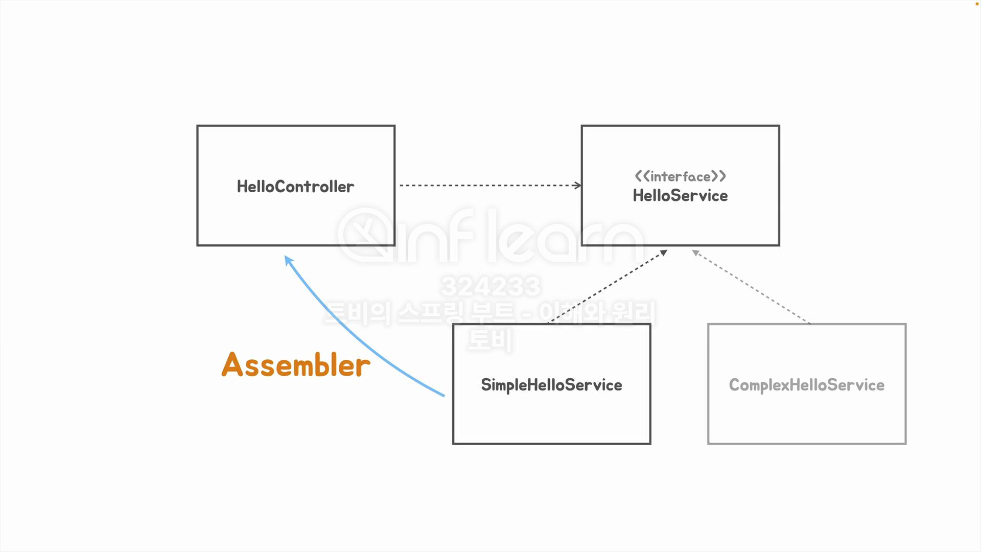 의존성 역전에는 결국 제 3의 존재를 필요로 합니다. 그 존재를 Assembler라고 합니다. HelloController는 HelloService 인터페이스를 구현한 어떠한 클래스에 의존을 하는데 소스코드 레벨에서는 의존을 하고싶지 않도록 구현하였습니다. SimpleHelloService에서 ComplexHelloService로 변경되었다 하더라고 소스코드를 수정하지 않도록!