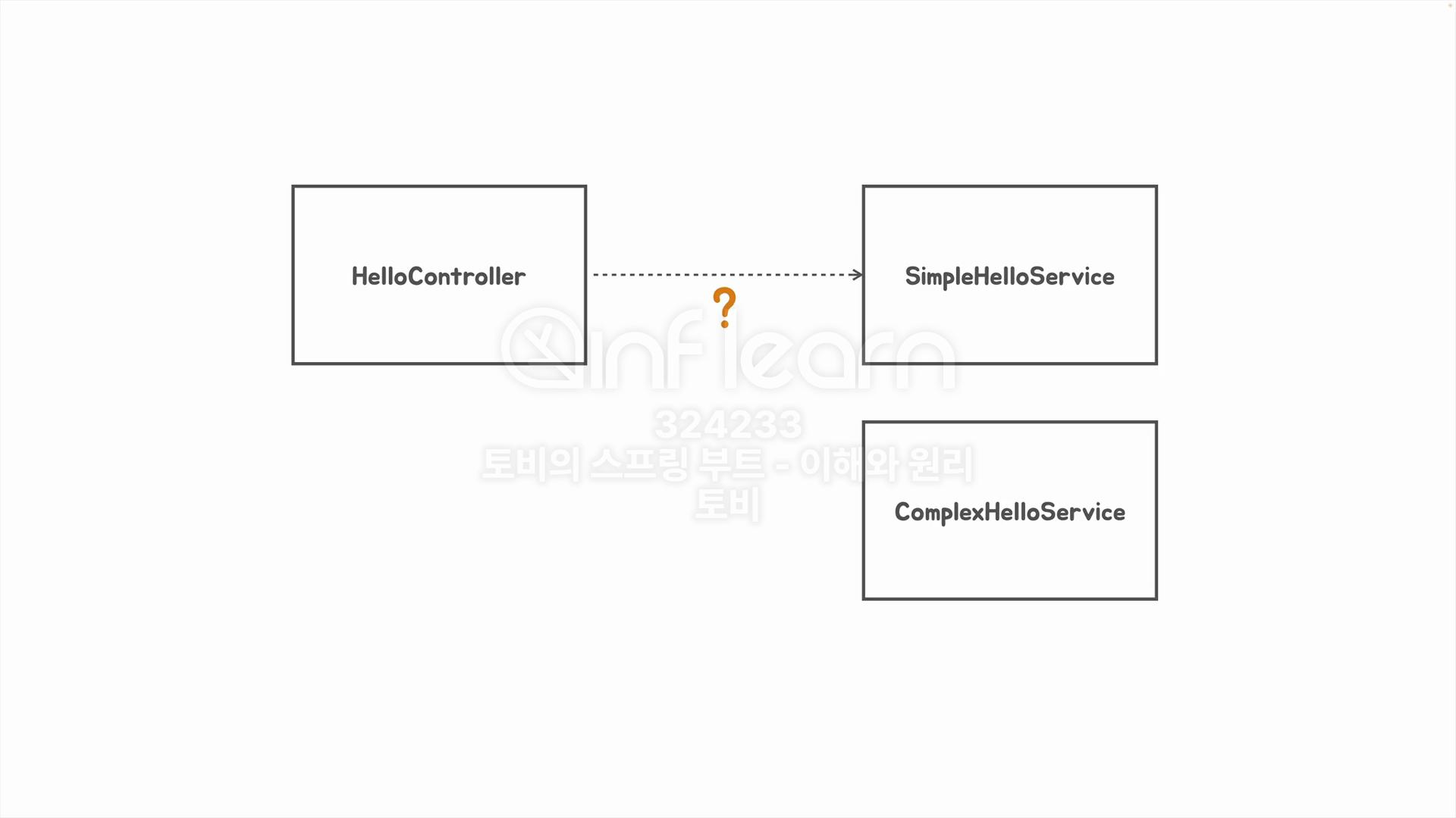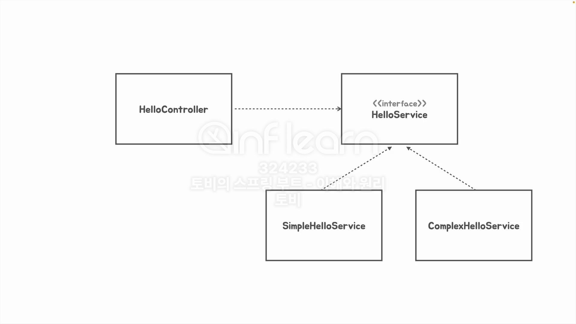 다만 의존관계의 문제점은 HelloController는 SimpleHelloService를 의존하다 ComplexHelloService로 변경해야할때 코드를 고쳐야하는 부담이 발생합니다.