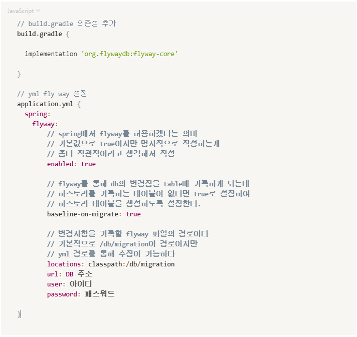 - flyWay의존성 주입시 버전별 이슈가있습니다. flyway core 버전과 db버전에 호환을 신경쓰셔야 하고 특정버전의 경우 유료로 사용해야하는경우도 있습니다. 이 부분은 flyway 정책을 확인하시기 바랍니다.