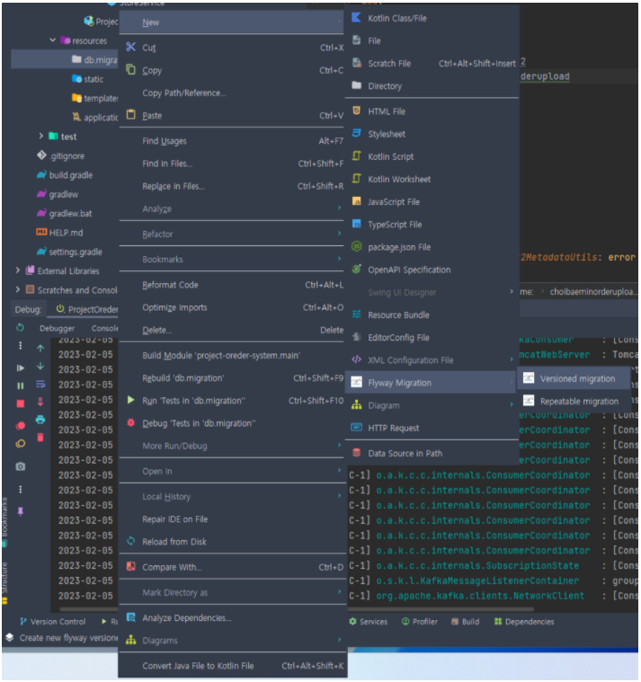플러그인을 설치하면 new 항목중 flyway Migration항목이 추가된걸 확인할 수 있습니다.