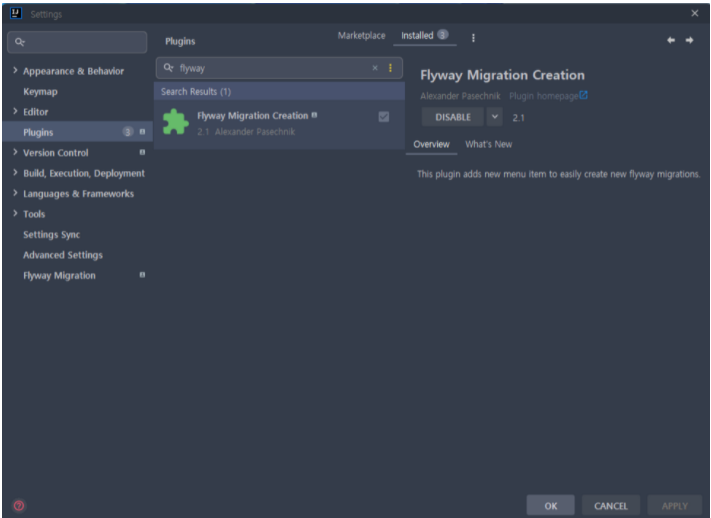 인텔리제이 플러그인 검색 화면에서 flyway를 검색하면 flyway migration Creation 플러그인이 있습니다.