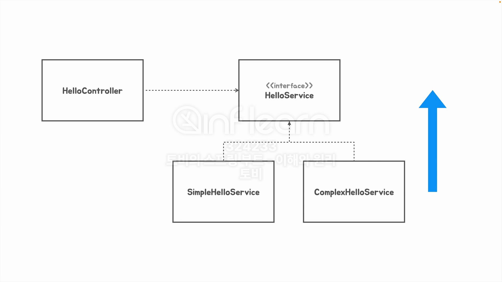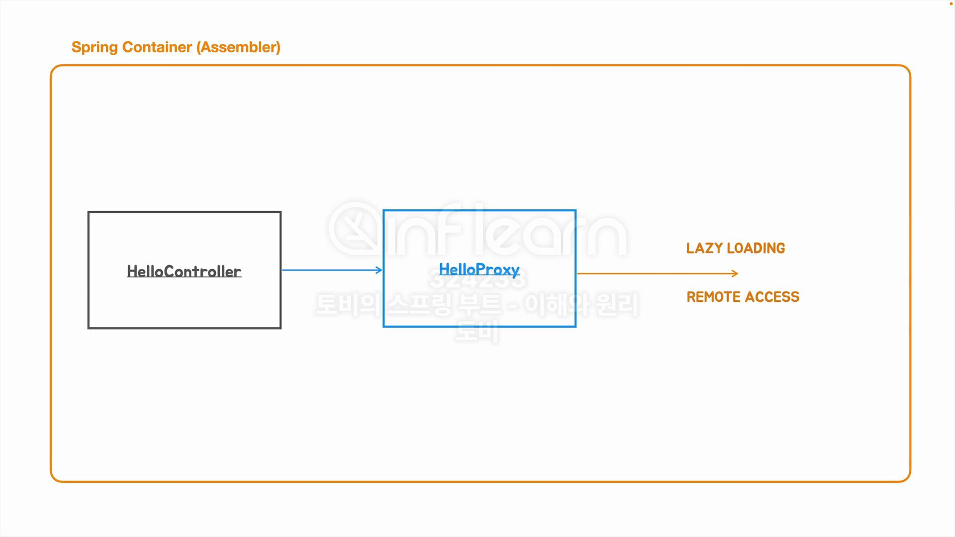 의존성 주입시에는 Proxy 패턴또한 적용할 수 있는데 HelloController가 의존성 주입받는 HelloService가 객체를 생성할때 많은 자원이 소모되어서 서버가 생성시에 해당 객체를 생성하지 않고 첫번째 요청이 있을때에 해당 객체를 생성하도록 지연 로딩을 한다던지 또는 HelloService의 실질 구현체가 로컬에 있는 객체가 아닌 외부 서버에 존재하는 객체를 사용 할 때 Proxy패턴을 통해서 이를 처리할 수 있게 됩니다.