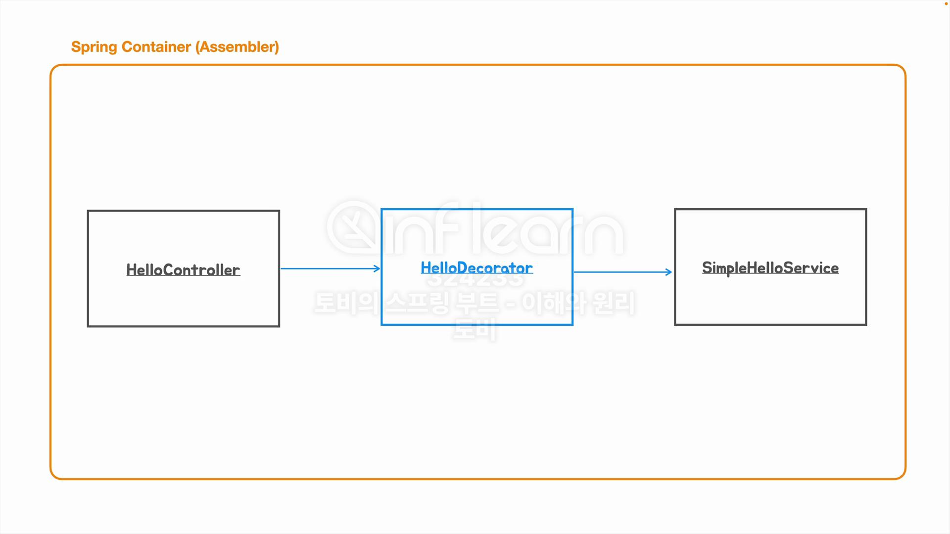 HelloDecorator은 @Primary어노테이션을 통해 HelloService 구현체중 가장 높은 우선순위로 Spring Container가 의존성 주입을 하게 됩니다. HelloDecorator가 주입받는 HelloService는 자기 자신의 객체를 제외한(순환참조 회피) SimpleHelloService를 주입받게 됩니다. 단 여기서 HelloService를 구현한 객체가 HelloDecorator, SimpleHelloService외에 더 존재하게 된다면 Spring Container가 HelloDecorator에 주입해야할 HelloService를 결정하지 못하게 되므로 오류가 발생하게 됩니다.