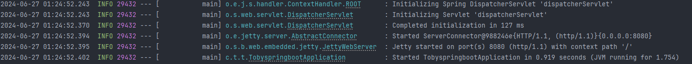 위처럼 구성하면 Tomcat이 아닌 jetty Servlet Container가 실행되는걸 확인할 수 있습니다.