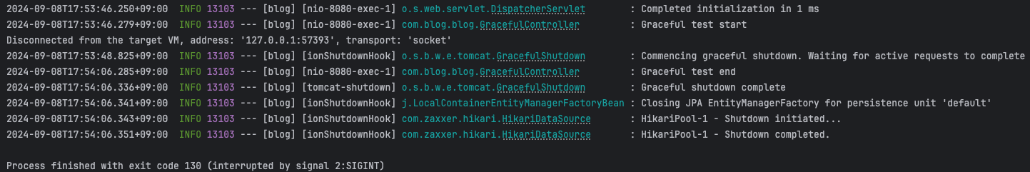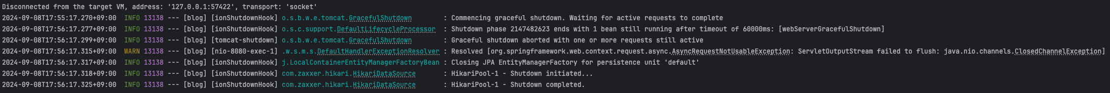 IDE 환경에서와 같이 Graceful Shutdown이 동작하는 부분을 확인하실 수 있습니다.