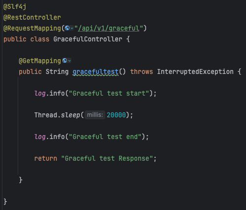 테스트 용도로 간단하게 Spring으로 Rest Api를 구성했습니다. 해당 Api를 호출하면 시작 로그 20초의 대기 마지막으로 로그를 출력하고 문자열을 리턴합니다.