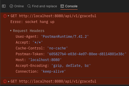 IDE 서버실행 환경에서 강제 종료했을때 soket hang up에러를 출력하였습니다. 해당 에러는 일반적으로 클라이언트와 서버 간의 연결이 예기치 않게 종료되었을때 발생하는 에러중 하나라고합니다.
