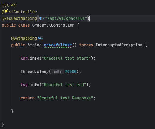 Thread.sleep 시간을 70초로 설정한 후 Graceful Shutdown을 할 경우 타임아웃 설정 60초를 넘어가기 때문에 요청을 마무리하지 않고 강제 종료되는 부분을 확인할 수 있습니다.