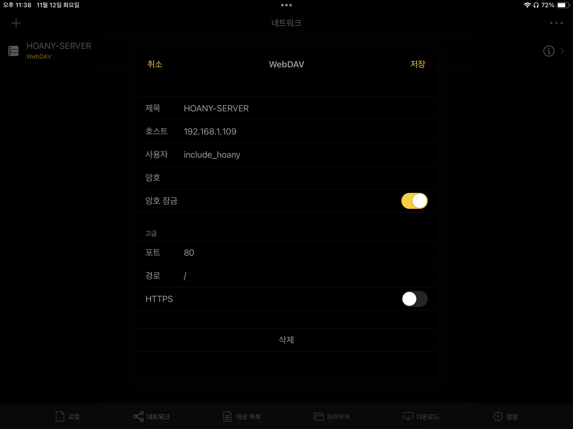 저는 집 내부 네트워크에서만 사용하기에 내부 네트워크 WebDav서버가 띄워져있는 컴퓨터의 IP를 입력하고 포트번호는 80 도커 명령어를 실행할때 환경변수로 입력한 아이디와 패스워드를 기입해 줍니다.