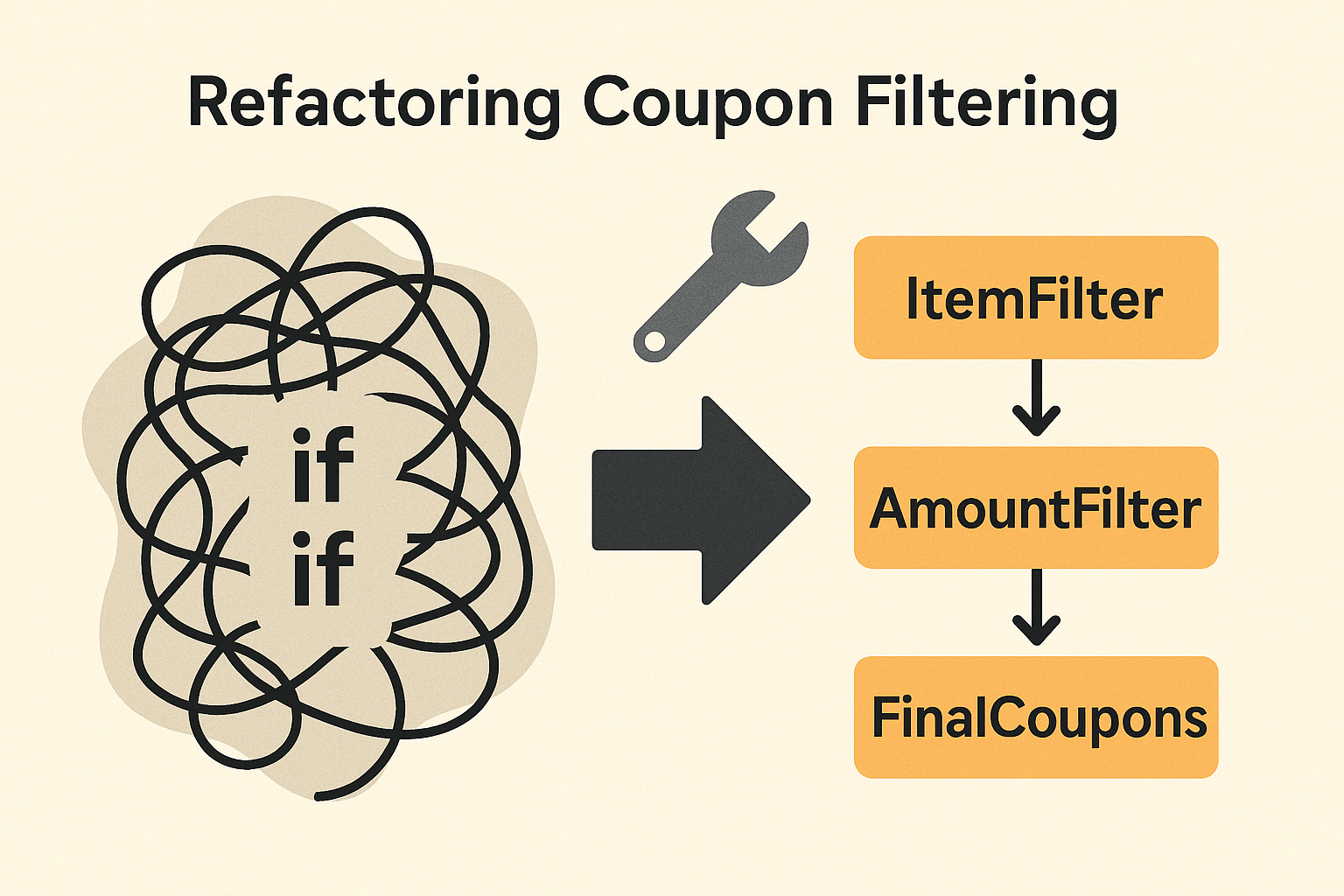 해당 기능을 처음 오픈할 당시 사용 가능한 쿠폰 목록을 처리하는 로직은 절차지향적으로 문제를 해소하였습니다. 이렇게 진행했던 이유는 처리하고자 하는 비즈니스 로직이 단순하기도 했고 해당기능이 고도화될지 예상하기 어려웠기 때문에 빠르게 해당 서비스를 고객들에게 적용하는데 우선순위가 높았기 때문입니다.