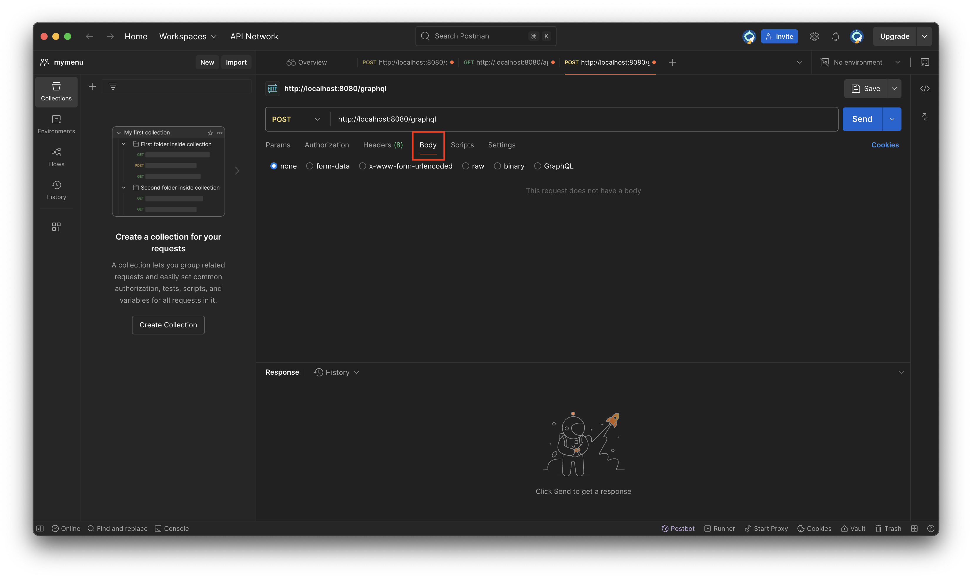 Body탭을 클릭후 GraphQL라디오 버튼을 클릭해 줍니다.