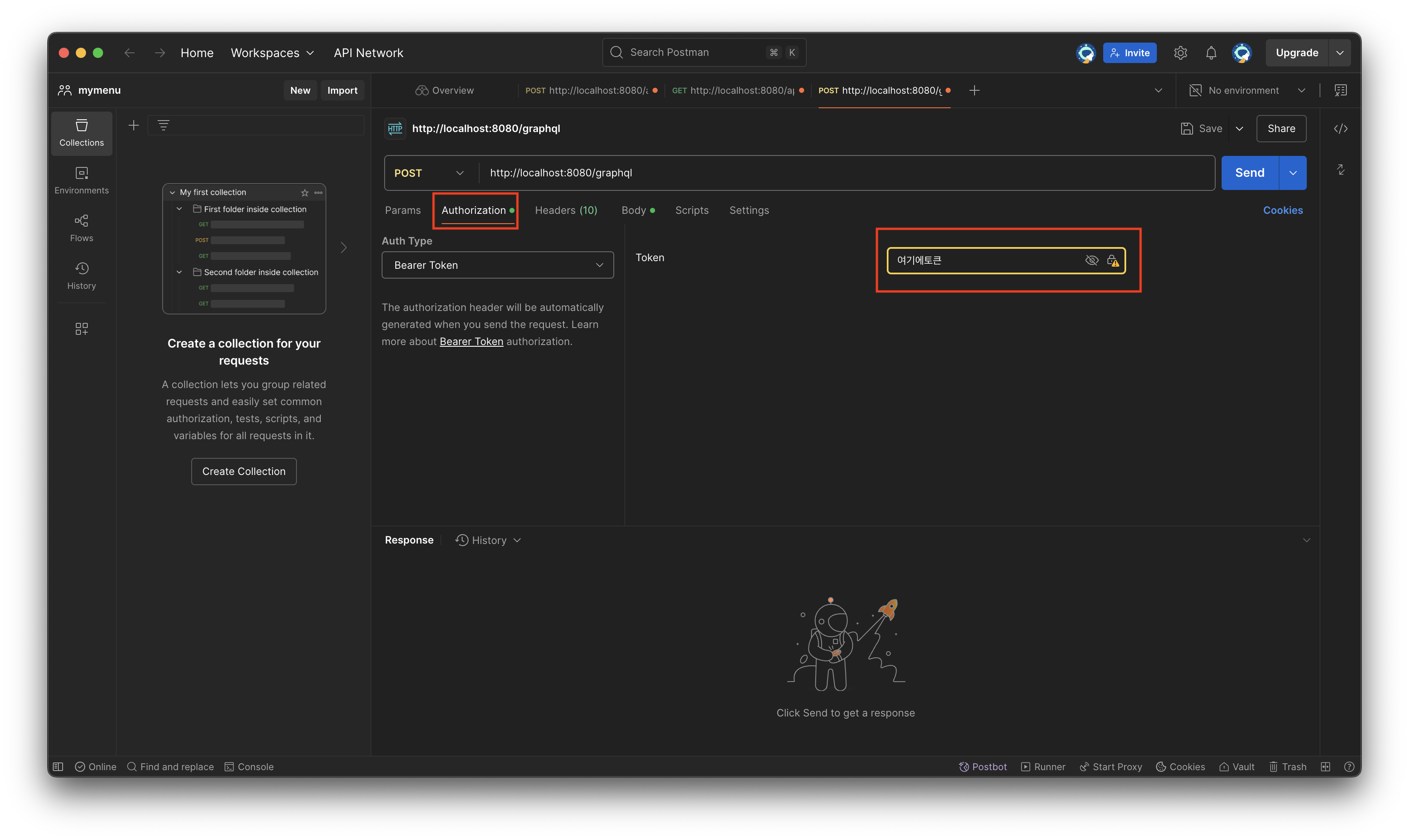 GraphQL은 HTTP프로토콜을 따르기 때문에 일반적으로 Header Token 인증을 한다면 Authorization탭에서 토큰을 명시하여 GraphQL요청을 보낼 수 있습니다.