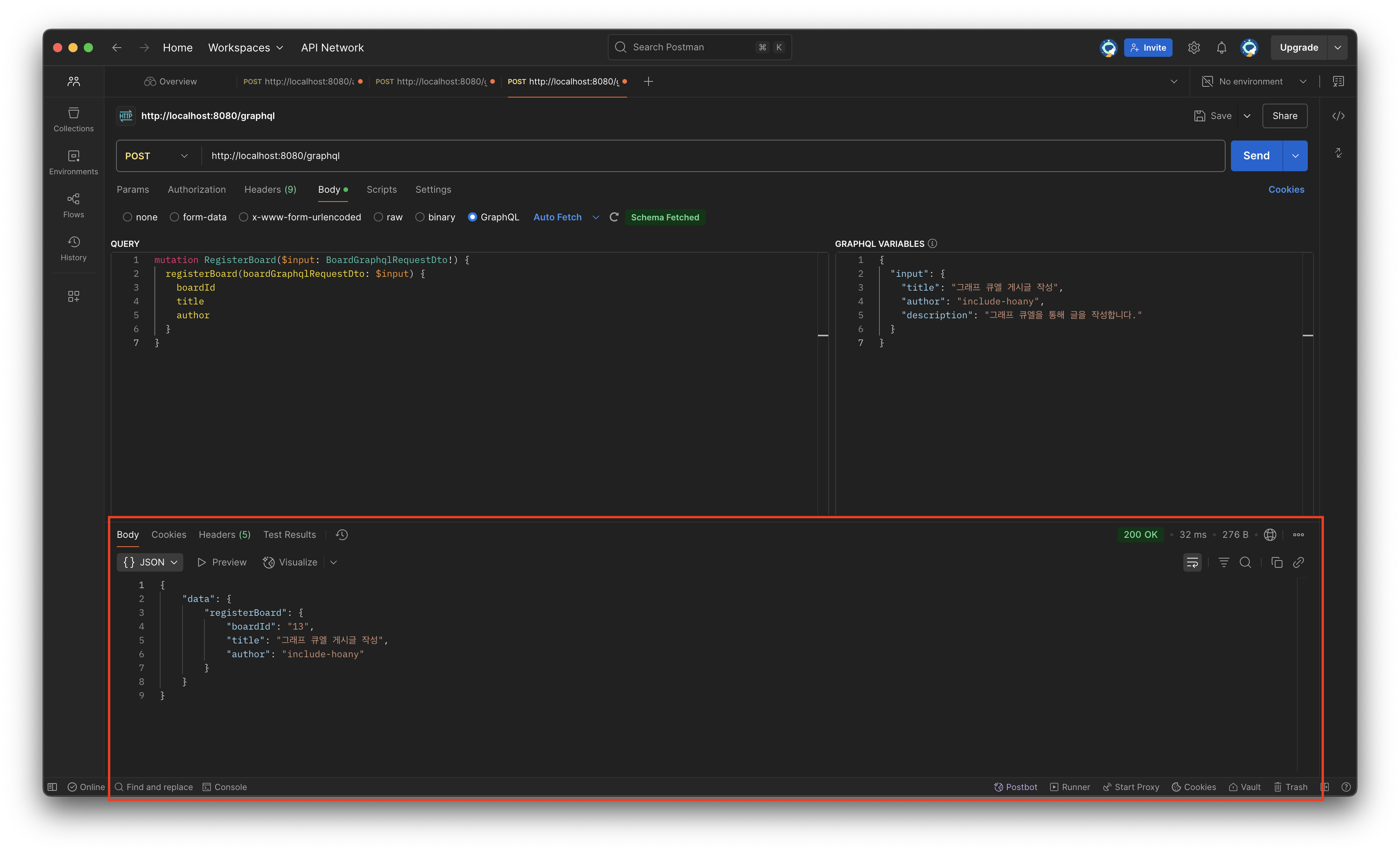 mutation요청에 의해 새롭게 등록된 게시글에 대한 정보가 응답 Body값으로 전달된 부분을 확인할 수 있습니다.