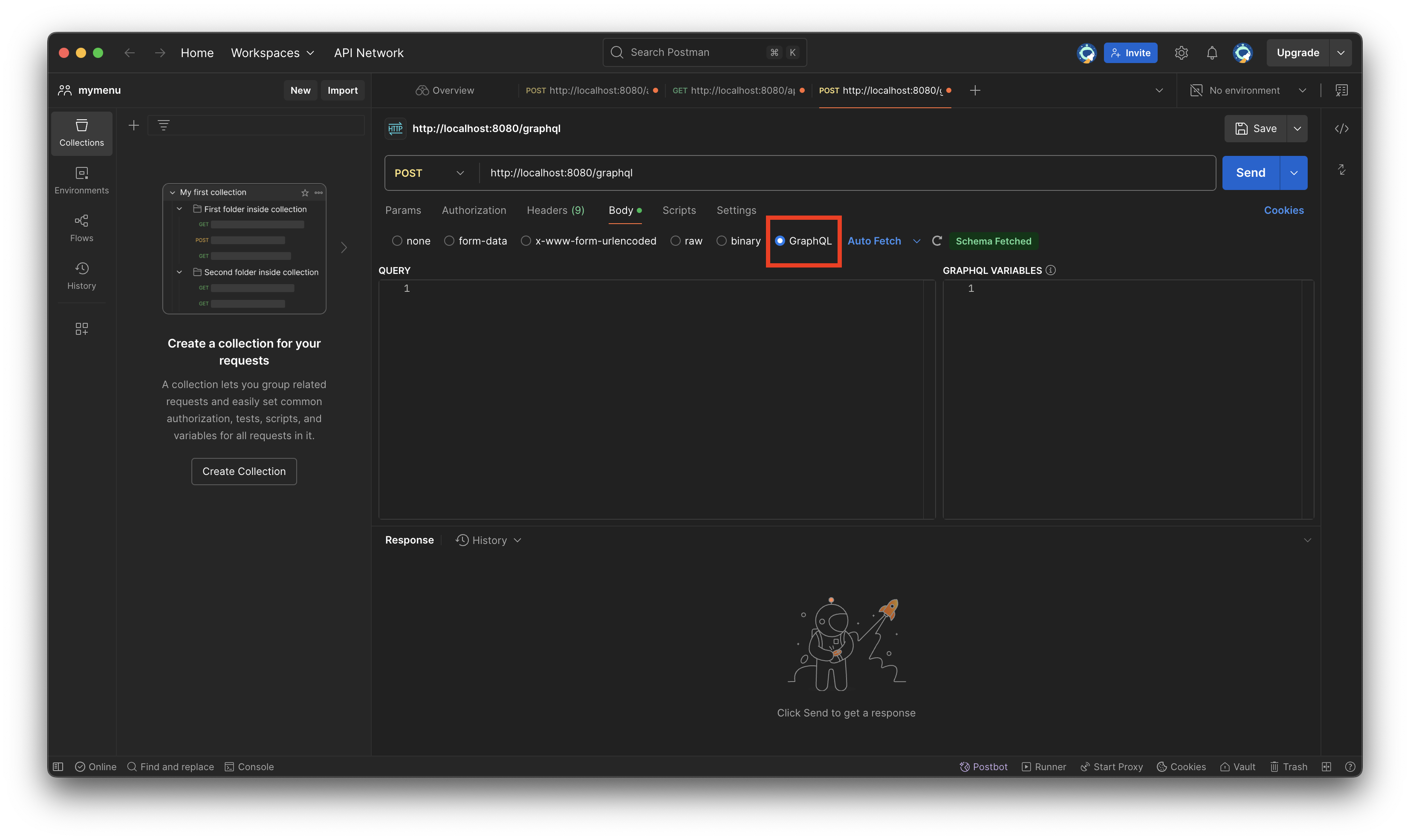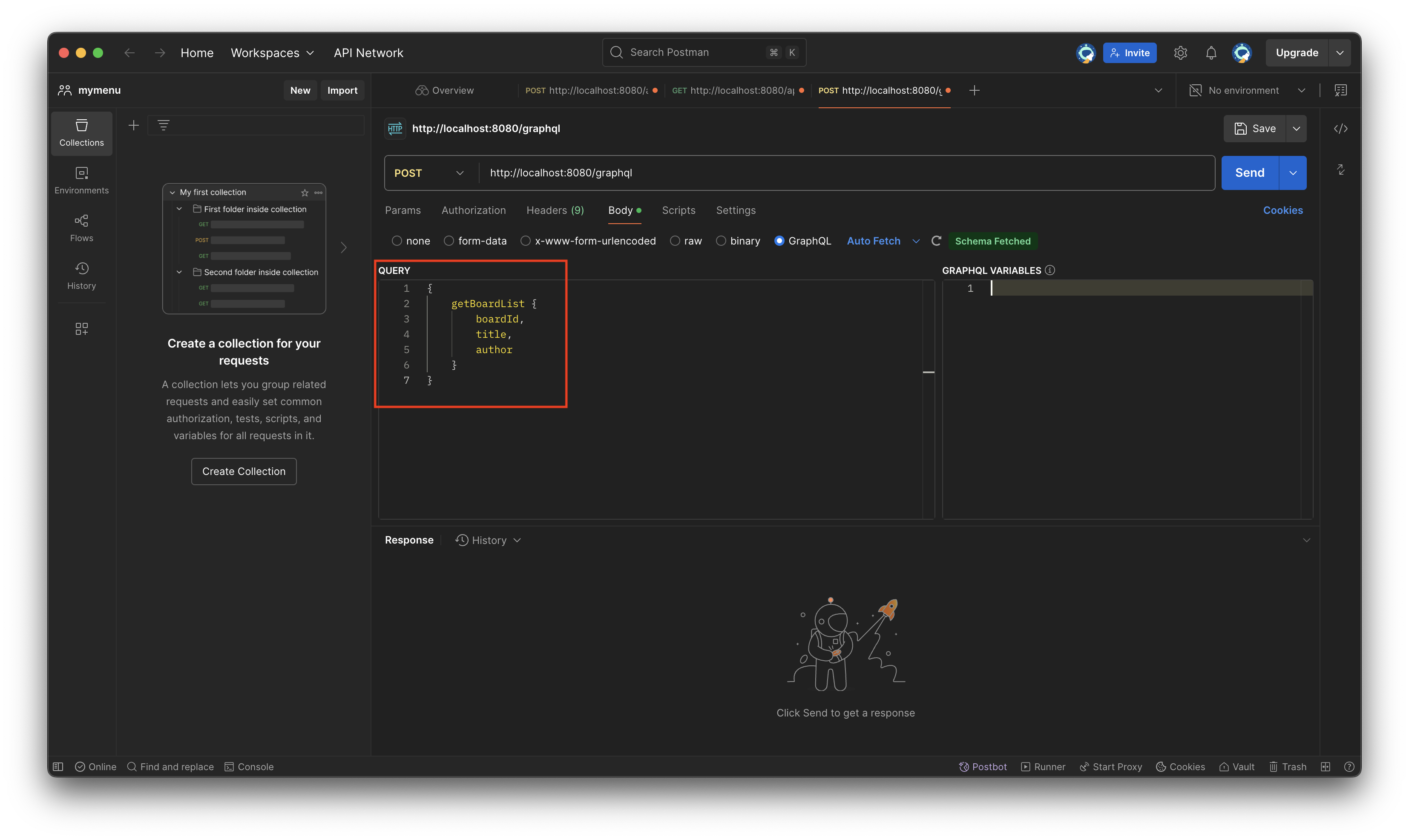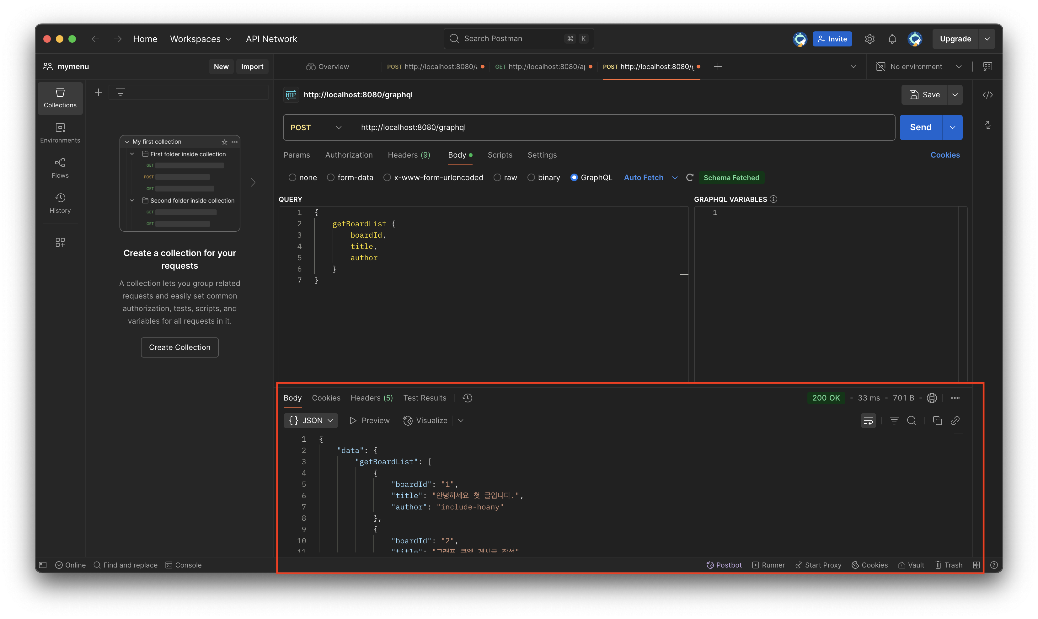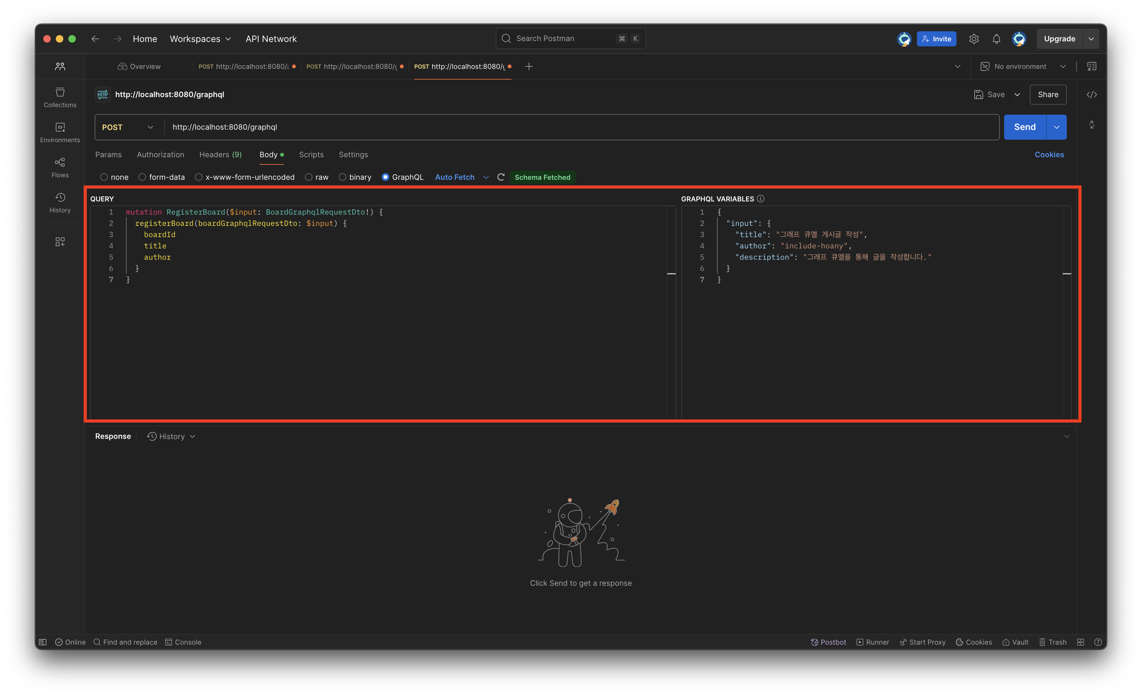 RestApi를 개발해오며 정말 많이 사용한 PostMan입니다. 예전에 PostMan으로 gRPC요청도 해보았는데 PostMan으로 GraphQL요청 또한 손쉽게 가능합니다.