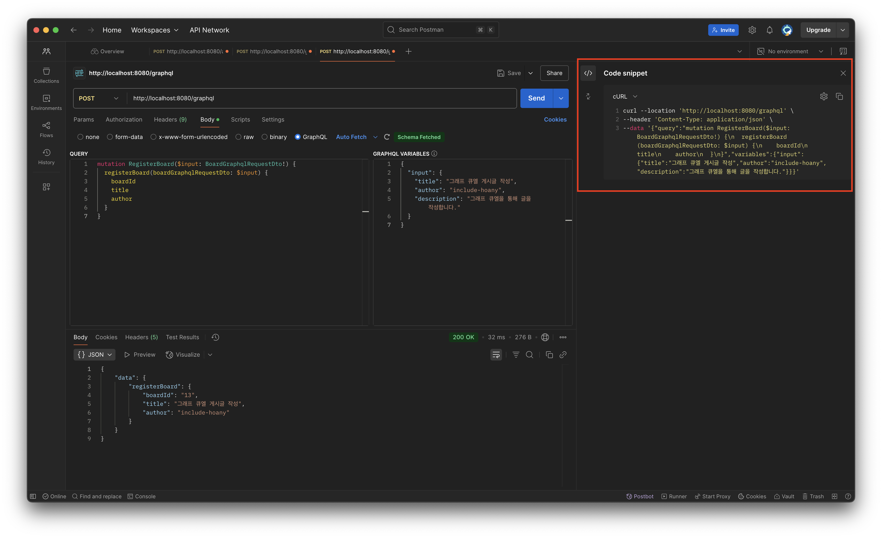 마지막으로 PostMan Code snippet창에서 작성한 요청을 다양한 코드의 방식으로 확인하실 수 있습니다. GraphQL 백엔드 개발을 하신다면 PostMan으로 간단하게 백엔드 서버가 이상없이 동작하는지 확인하실 수 있습니다. 개발에 참고하시면 좋을 것 같습니다.