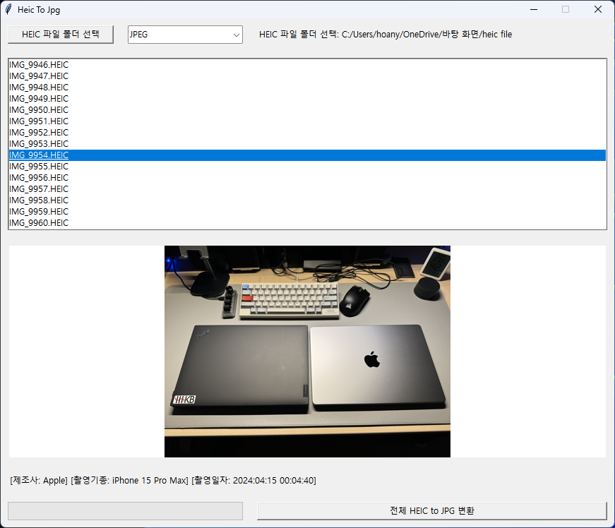 What's Changed 별도로 저장경로를 선택하는것이 아닌 heic파일이 존재하는 폴더에 jpg, png 폴더를 생성하여 변환된 jpg, png 파일을 저장하도록 구현 파일 리스트에서 파일 선택시 선택한 사진을 미리